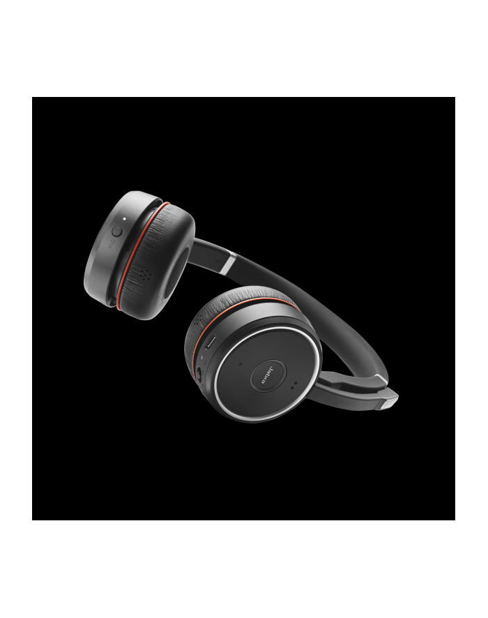 Jabra Evolve 75 UC Stereo. Typ produktu: Zestaw słuchawkowy. Technologia łączności: Przewodowy i Bezprzewodowy, Bluetooth. Rekomendowane użycie: Biuro/centrum telefoniczne. Pasmo przenoszenia: 20 - 20000 Hz. Skuteczność usuwania szumu. Zasięg bezprzewdowego router'a: 30 m. Waga produktu: 177 g. Kolor produktu: Czarny, Czerwony