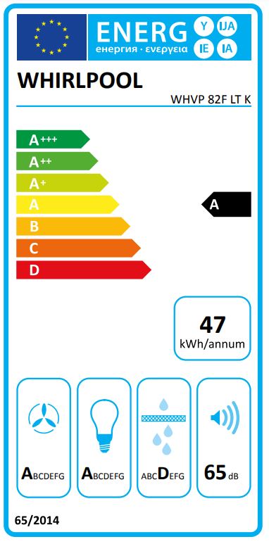 Whirlpool WHVP 82F LT K. Maksymalna moc ekstrakcji: 470 m³/h, Klasa wydajności przepływu dynamicznego: A, Klasa wydajności świecenia: A. Model: Wbudowany, Kolor produktu: Czarny, Długość przewodu: 1,5 m. Rodzaj filtra tłuszczu: Aluminium. Klasa wydajności energetycznej: A, Roczne zużycie energii: 47 kWh, Skala efektywności energetycznej: A +++ do D. Szerokość produktu: 798 mm, Głębokość produktu: 326 mm, Wysokość (max.): 32,6 cm